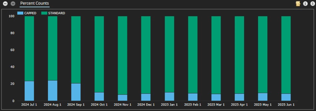 Percentages of trades reported above the capped threshold were in the 8.5 to 9.5 percent range in Q2 0225, continuing the lower level of capping resulting from the increase in block sizes early in Q4 2025.