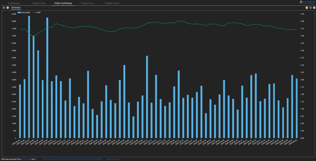 Chart 1: Q2 2025 USOSFR10 day-by-day notional and VWAP. Source: SDRView