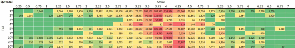 - 1Y and 4 percent were the most active tail and strike (compared with 1Y and 4.25 percent in Q1).