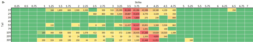 - The most active tail was 1Y, with $1,171 billion traded across all strikes, largely driven by $831 billion traded in strikes of 3.5, 3.75, 4, and 4.25 percent.
