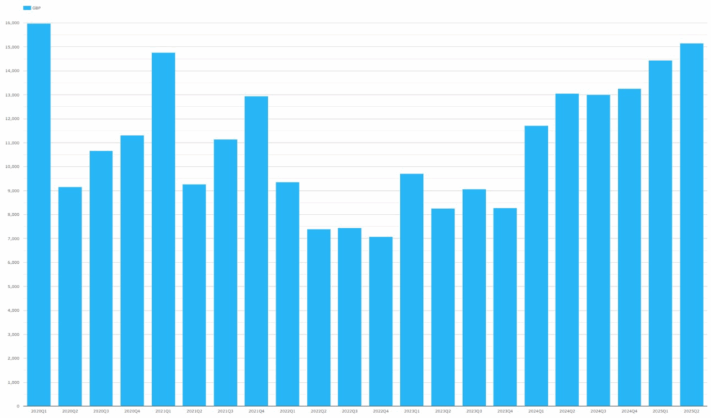 - Q2 2025 GBP rates derivatives traded $15.2 billion DV01 in Q2 2025 – up 16 percent YoY from $13.1 billion DV01 in Q2 2024, and up 5.5 percent QoQ from $14.4 billion DV01 in Q1 2025.