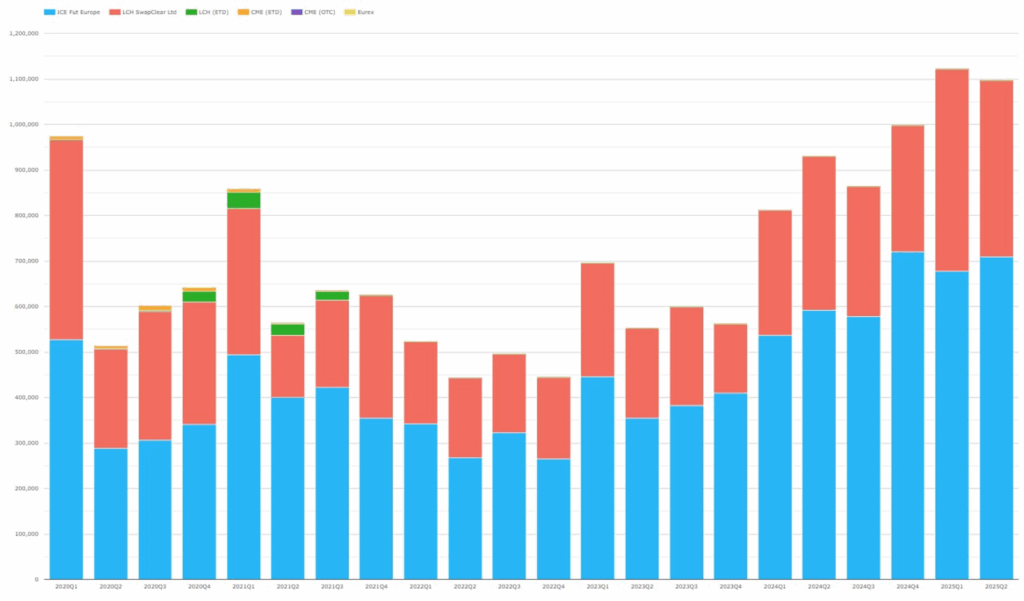 - ICE Europe futures – mainly SONIA futures – hit a record £720 billion in Q4 2024, with Q1 and Q2 2025 not far behind and higher than all prior quarters.