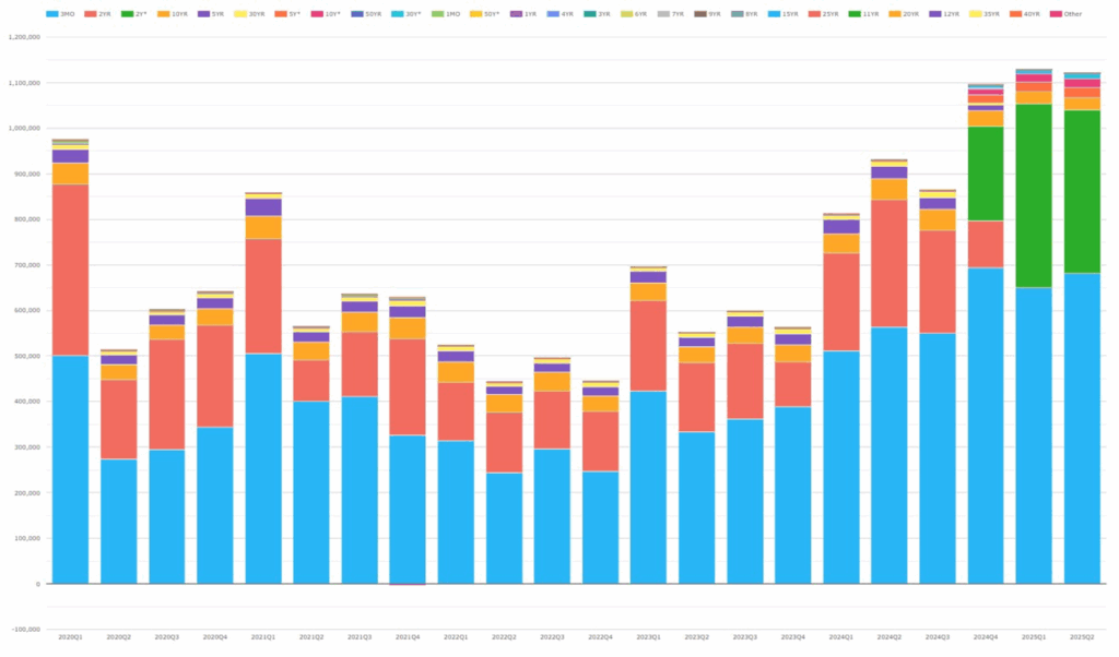 - Q2 2025 was the second highest quarter ever, only outstripped by the Covid-19 driven peak of $16.0 billion DV01 in Q1 2020.