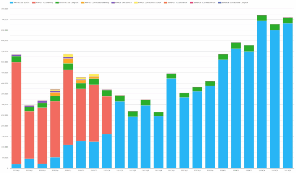 - ICE SONIA contract also surpassed all prior quarters’ ADV of the ICE sterling contract (MMFut: ICE Sterling), which it superseded in the LIBOR transition.