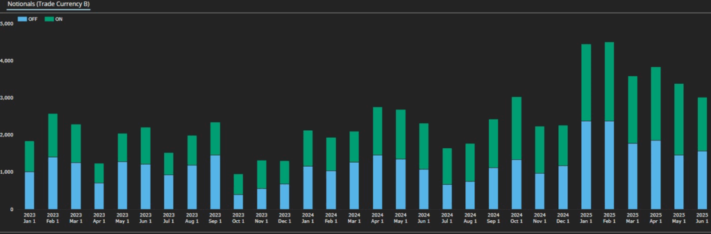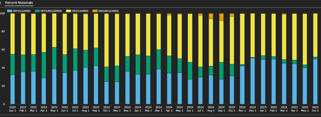 We are not sure whether this unusual temporary pattern caused by genuine trading activity changes, or perhaps by an initiative to correct US-reporting anomalies for activity traded on European platforms. However, we can say that the month-by-month US reported cleared percentage for GBP OIS increased from 80 to 96 percent on average between H1 2024 and H1 2025.