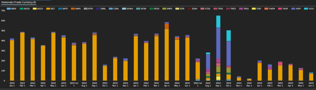 - From November 2024 onwards, the pattern reverted – uncleared trades were again dominated by BILT with little on-platform uncleared trade activity.
